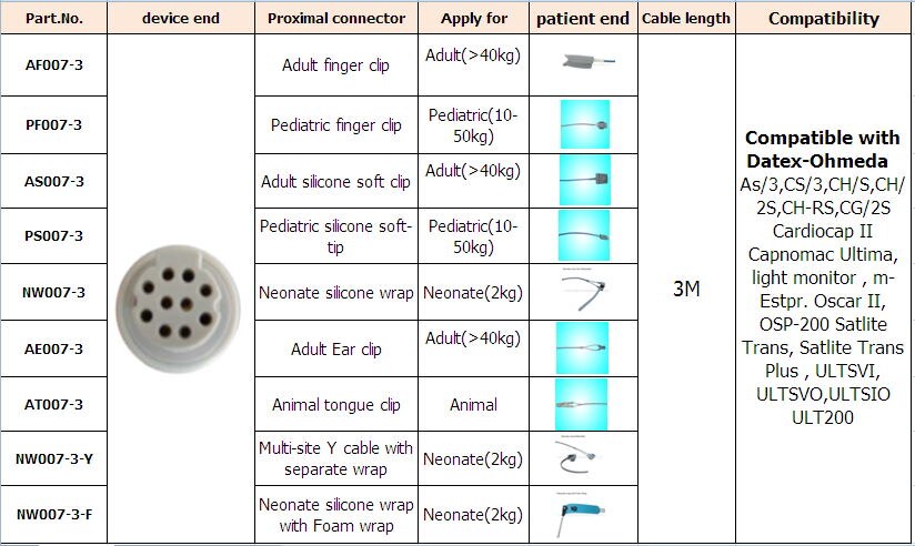 AF007-3 سازگار با Datex-Ohmeda As / 3، CS / 3، CH / S، CH / 2S، CH-RS، CG / 2S Cardiocap II Capnomac Ultima ، مانیتور نور ، m-Estpr. Oscar II، OSP-200 Satlite Trans، Satlite Trans Plus، ULTSVI، ULTSVO، ULTSIO ULT200